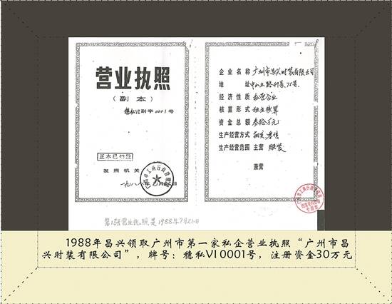 1979年,改革开放之初,在人们对待“经商”一事仍普遍处于观望状态时,位于广州市越秀区中山五路的昌兴服装,成为民营经济的星星之火。那一年,陈识多的爷爷陈兴昌率先到工商局申请了个体工商户营业执照,成为广州第一个个体户。近十年后,这张执照改换成了编号为“穗私V1副字0001号”的私人企业营业执照。
