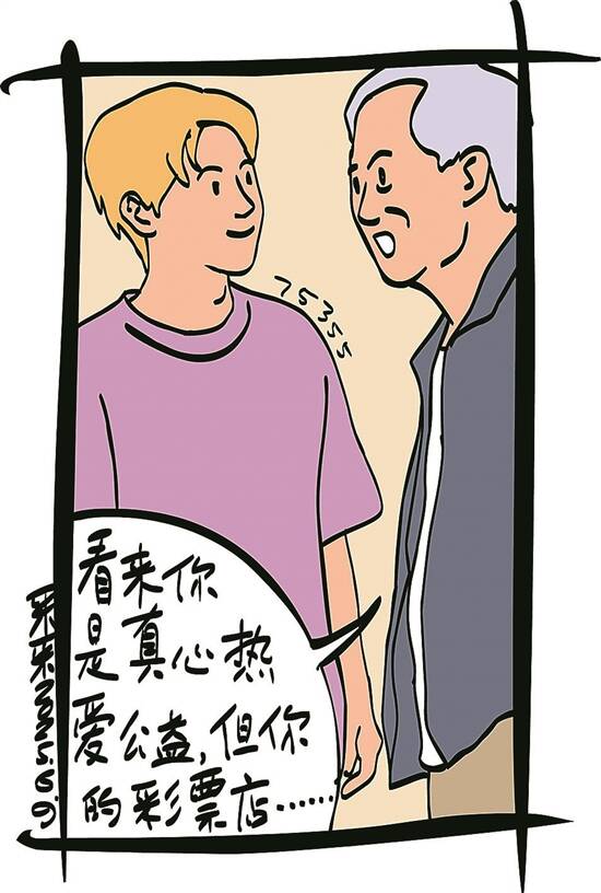 过了一星期,老李再次组织大家去福利院,没想到王超又来了。老李说:“看来你是真心热爱公益,但你的彩票店还得守啊,要不,这次你就不参加了。”王超说:“您放心好了,我叫朋友在帮忙看店呢。何况,我现在从事的彩票工作,本来也属于社会公益事业,以后只要有机会,我都会跟着您。”