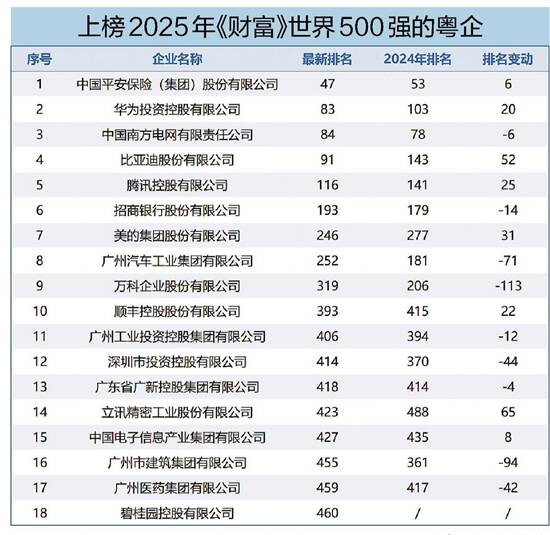 广东省共有18家企业登上《财富》世界500强排行榜,比去年增加1家。总部位于佛山的碧桂园于2024年短暂跌出榜单后,今年重回榜单,位列第460位。中国平安、华为、南方电网、比亚迪冲进榜单前100名,其中比亚迪为首次进入前100位。