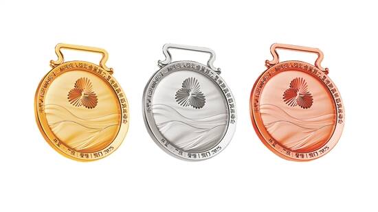 顶端挂钩采用岭南特色“镬耳屋”造型,奖牌正面镌刻会徽、海浪纹,背面以港珠澳大桥为背景,镌刻吉祥物中华白海豚高擎火炬