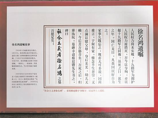 徐泽回忆,奶奶传下来的爷爷的物件,只有一对当年的结婚戒指,分别刻着夫妇二人的名字。爷爷留下的遗书,奶奶一直没能拿到手稿,后来还是从刊登了遗嘱的《申报》上手抄一份留念。这份遗嘱将以纪念墙形式呈现于烈士墓前。丰顺县人民政府特意从蔡廷锴将军遗留的手稿中集字而得“社会主义者徐名鸿”,呈现于墙上,以圆烈士心愿。