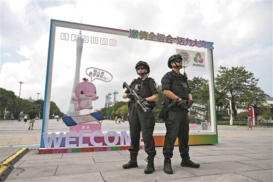 在广州花城广场海心沙、广州塔景区、北京路步行街等地,全副武装的特警和科技感十足的电子警犬亮相街头巡逻,成为一道亮丽的十五运会风景,吸引大批市民合影点赞:“太酷啦!”“看到他们就觉得超有安全感。”