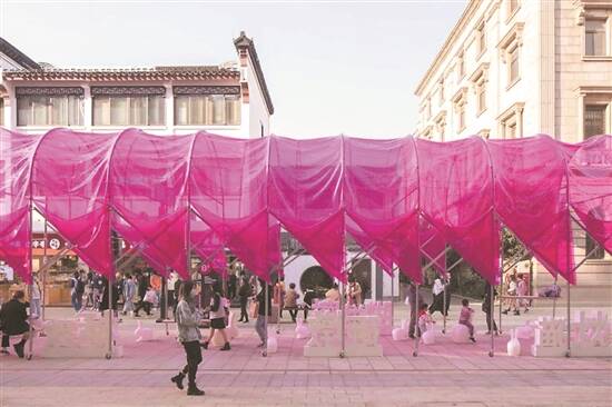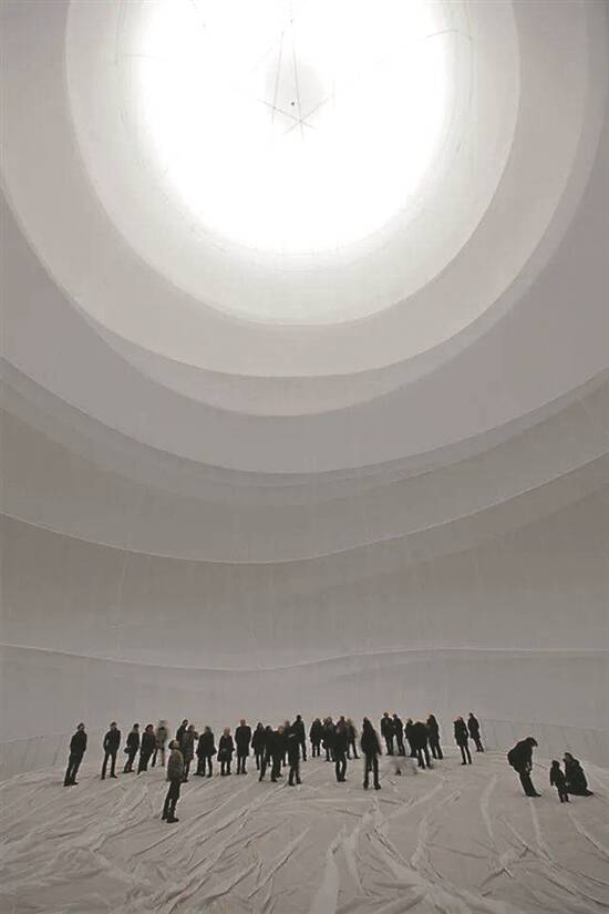 后来,1970年的大阪世博会上,美国馆临时采用过一个139m×78m的椭圆平面低轮廓气膜穹顶设计;1988年,日本东京巨蛋多功能体育场采用了一个巨大的蛋形空气穹顶,该项目一度让这种空间设计风靡全球;在我国苏州一个国际设计周上也曾启用过一个“三色顶”充气装置,旨在激活一些未充分利用的城市公共空间,以亭子的形式呈现,解决场地缺乏遮蔽物、座位和休息场所等特定的情况;2010年,国际知名艺术家克里斯托设计了过一个“最大的室内雕塑”——“大空气包”,高90米,宽50米,由20350平方米的半透明聚酯织物和4500米长的绳子制成;2018年,Antepavilion临时性建筑大赛在英国伦敦开幕,一个名为“AirDraft”的充气剧院被摆放在一艘旧驳船上,打造出一个漂浮的音乐和表演场所;在葡萄牙阿尔加维某海滩上,也出现过一套可重复使用的气膜装置,随时满足不同节日需要,既打造出一系列户外休息和娱乐区域,又能合理地融入周围环境。