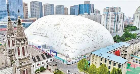 最近在山东济南的闹市区、洪楼百年教堂和山东大学校园之间,出现了一个巨大的“白胖子”,它的高度达到了50米,覆盖了约两万平方米的地方,据说已达到了“世界最大”的标准——这其实是在搭建济南规模最大的一个城市更新项目——洪楼1905项目,一个全新的国际潮流街区。为了减少建设过程中飞扬的尘土和轰鸣的噪声,在建筑工地上搭起的一个巨大的充气穹顶。