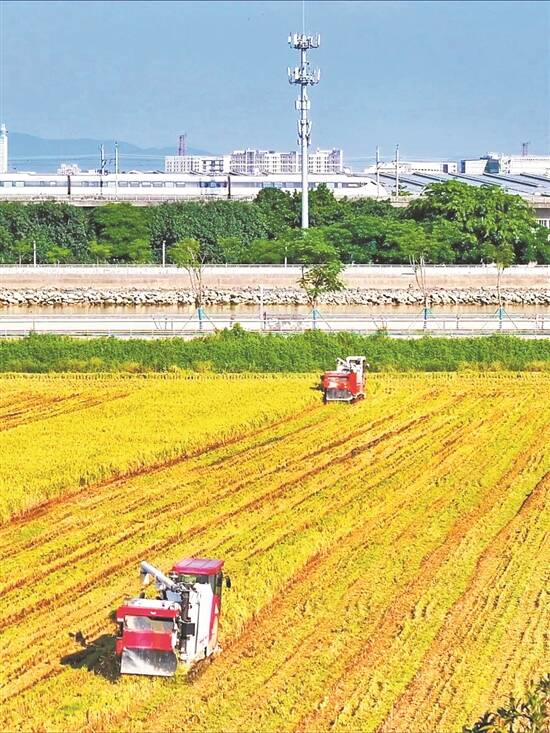 大型收割机轰鸣,在广袤田间纵横驰骋。机械臂“吞”入饱满的稻穗,“吐”出金黄、清香的谷粒,一首充满喜悦与力量的“丰收曲”,正在洪梅大地上激情奏响。