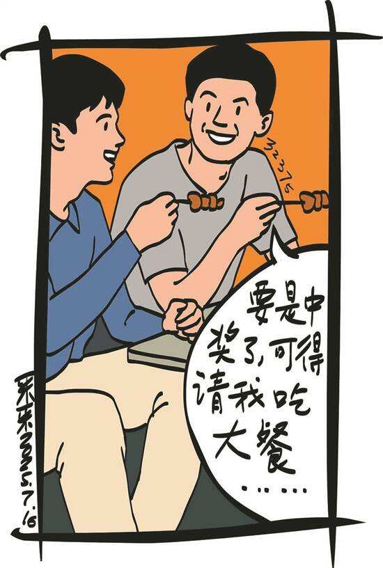 两人坐下来,就着啤酒吃烤串。宋磊开玩笑说:“你抄了我的号码,要是中奖了,可得请我吃大餐。”倪强点头如同鸡啄米,说:“我不是铁公鸡,哪怕是5元钱奖金,我也会兑现。”