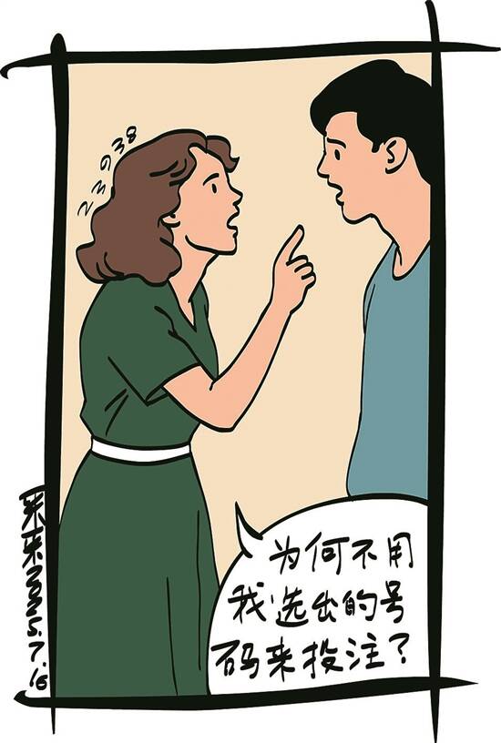这一天,李小明买彩票时,一时兴起,忘了魏采儿的嘱咐,没有投注她特意选定的几个号码。结果,开奖号码公布了,魏采儿一看,她选的一组号码中了一个二等奖,可就因为李小明没有听她的话,错失了好几万元的奖金呢!这下好了,妻子大为不满,怒气冲冲地指责丈夫,为何不选她特意选的号码。