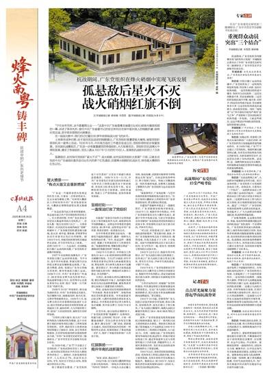 张启良:广东党组织在华南抗战中发挥了中流砥柱的作用。在华南抗战的过程中,广东党组织的大发展,主要起到了三个方面的重要作用:一是高举抗日民族统一战线伟大旗帜,带领全省人民掀起轰轰烈烈的抗日救亡运动,促进南粤人民的抗战觉醒;二是建立人民抗日武装,开辟华南敌后战场,沉重打击和牵制大量侵华日军,也付出了巨大的民族牺牲;三是加强与太平洋东方战场的美英盟军开展军事、救援和情报等方面的国际合作,为世界反法西斯战争的胜利作出重要贡献。