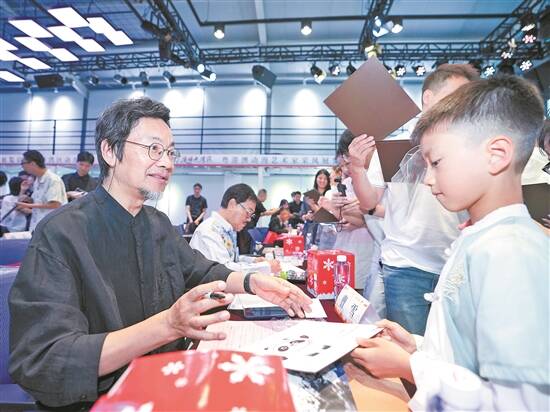 被誉为金庸“御用”画家,香港著名武侠漫画家、香港动漫画联会荣誉顾问李志清登台进行即兴创作。短短十分钟,一幅蕴含湾区特色和武侠意蕴的墨宝跃然纸上,赢得全场喝彩。创作完成后,李志清将这幅珍贵作品赠予羊城晚报报业集团,寄寓艺术界与媒体携手助力湾区动漫产业发展。