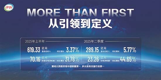 8月28日,伊利股份发布2025年中报,上半年实现营业总收入619.33亿元,同比增3.37%,半年营收即领先行业第二名超200亿元;实现扣非归母净利润70.16亿元,同比大增31.78%,是行业第二名的三倍多,绝对龙头领先优势持续扩大。
