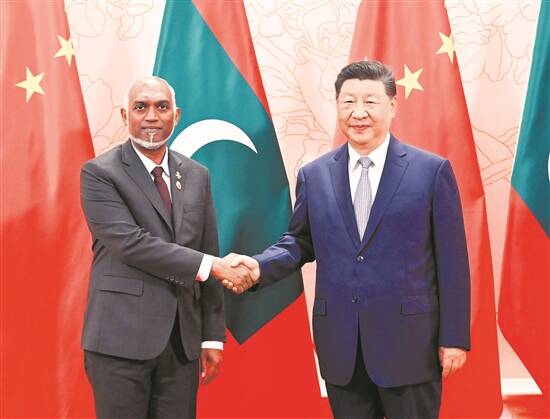 习近平强调,中方将继续支持马尔代夫维护国家主权、独立和领土完整,探索符合本国国情的发展道路。愿同马方加强政党、立法机构、政府等各方面交往,增进相互了解和信任,促进两国人民相知相亲。持续深化务实合作,落实好中马自由贸易协定,开展渔业、海洋科考、环境保护、防灾减灾等合作。加强沟通和协作,维护共同战略利益和国际公平正义,携手构建人类命运共同体。