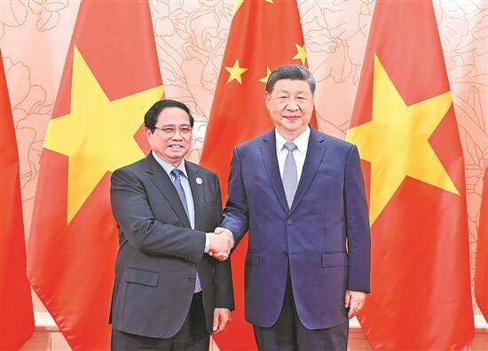 习近平指出,我今年4月对越南进行国事访问,双方就新形势下推进中越命运共同体建设达成重要共识。两国各部门各地方要加紧落实,推动中越全面战略合作取得更多实质性成果。面对加速演进的百年变局和变乱交织的国际形势,中越要坚定道路自信和制度自信,加强团结协作,推动中越命运共同体航船始终沿着正确方向稳步前行。