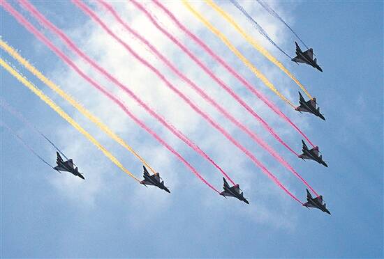 空军八一飞行表演队驾驶歼-10表演机,以超密集编队出场。7架战机在空中划出14道彩烟,寓意着中华民族14年可歌可泣的抗战历程,象征着14亿多中国人民奔向强国复兴的绚丽前景。