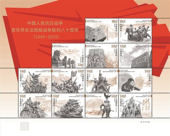 当天上午,中国邮政在广州中山纪念堂同步发行《中国人民抗日战争暨世界反法西斯战争胜利八十周年》纪念邮票1套13枚、小型张1枚,全套面值为20.8元。