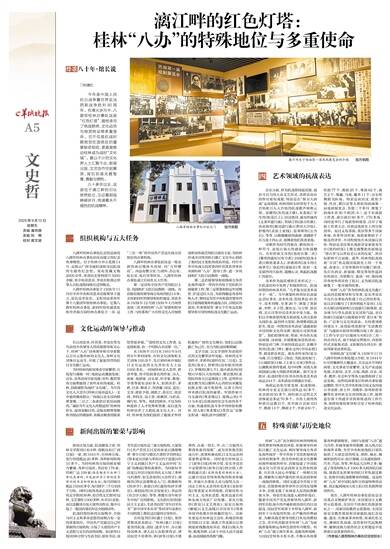今年是中国人民抗日战争暨世界反法西斯战争胜利80周年。在烽火岁月中,八路军桂林办事处这座“红色灯塔”,曾经承担了统战联络、文化动员与物资转运等多重使命。它不仅是抗战时期我党在国统区的重要秘密枢纽,更直接推动桂林成为战时“文化城”。数以千计的文化界人士汇聚于此,新闻出版、文艺创作空前繁荣,背后则是无数智慧、勇毅与牺牲。