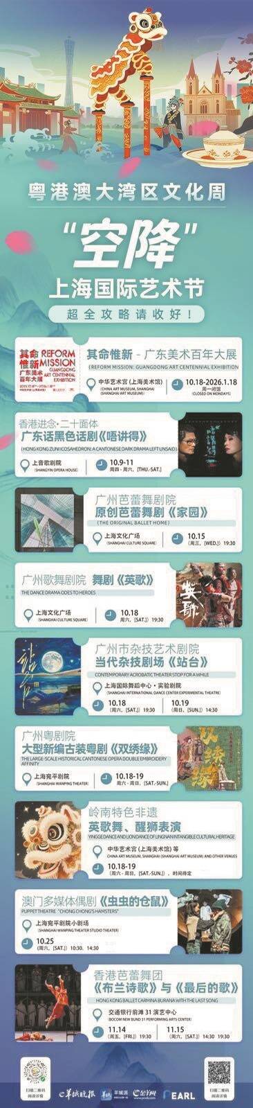广东省作为本届艺术节的主宾省,与组委会共同举办的“粤港澳大湾区文化周”,将于10月18日在沪启幕。精选舞台力作、百年美术经典、活态非遗项目与优质文化产品,共7台14场精品演出、岭南画派大展、非遗展示和艺术教育的活动,将以“文化周”为平台登陆上海。