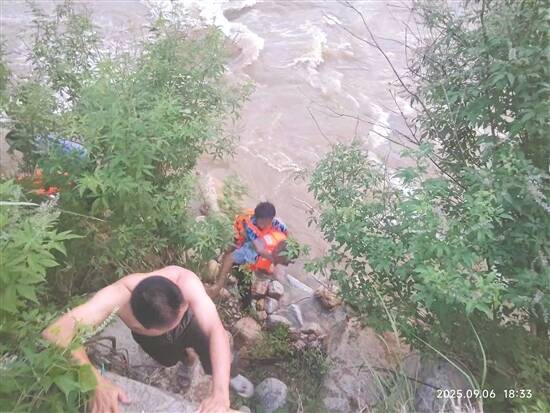 “你不要动!抓紧一点,我们马上就下来了!”李序样向小男孩喊道。随即,他和刘奋荣以及在现场救援的村干部马伟生一起跳入湍急河水中,将两根救生绳绑在一起,指挥大家一起合力救人。