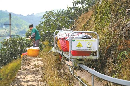 随着果期的到来,甜柿成熟量一天比一天多。为提升采摘运输速度,北梭村的甜柿种植示范基地第一时间启动了山地单轨运输系统。记者现场看到,满载着一筐筐甜柿的轨道车在陡坡果园里穿梭运行,每次能将100多公斤甜柿运载下山。得益于轨道运输系统的高效运转,甜柿从采摘到包装车间时间大大缩减,更好地保持了果实的新鲜度和糖度。