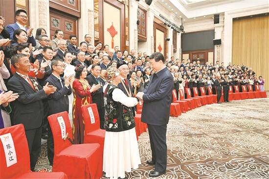 习近平等来到接见现场时,全场响起长时间热烈掌声。习近平向大家挥手致意,不时同代表亲切交流,并同大家合影留念。