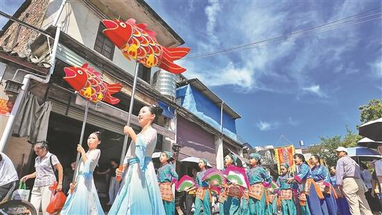 几个方阵组成了巡游队伍,从佗城景区学宫广场出发,沿着当地古色古香的街道行进,演员们同台献艺,轮番登场,形成精彩纷呈的“打擂”效果。
