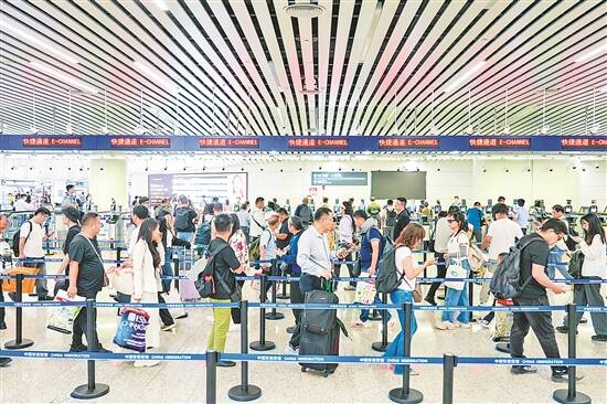 假期最后一天,广州白云机场口岸的边检出境大厅人头涌动。拖着行李箱、准备返回莫斯科的谢尔盖夫妇向记者分享了“中国游”感受。“我们去了广州塔和永庆坊,夜景很美,到处都很热闹,广式月饼口感很棒。”