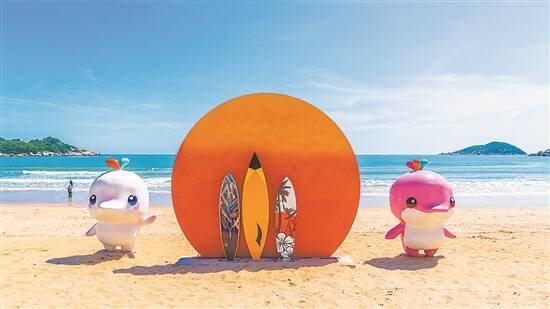 而在南澳岛,独具特色的全运景致也接连“上新”:青澳湾北回归线广场上,吉祥物中华白海豚“喜洋洋”“乐融融”雕塑憨态可掬,与贝壳、海浪、灯塔等海岛元素相融合,搭配全运标语打造特色打卡点,“追青澳第一缕阳光,打卡全运活力”成新风尚。