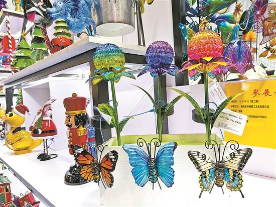福建泉州德耀工艺品有限公司的展位前,一款售价仅2美元的太阳能花园摆件成了“爆款”——塑料与铁材质搭配,加上太阳能板,能发出不同颜色的光。负责人林建明介绍,公司主营铁工艺品,年出口额达4000万元人民币,来自美国的客户最多。