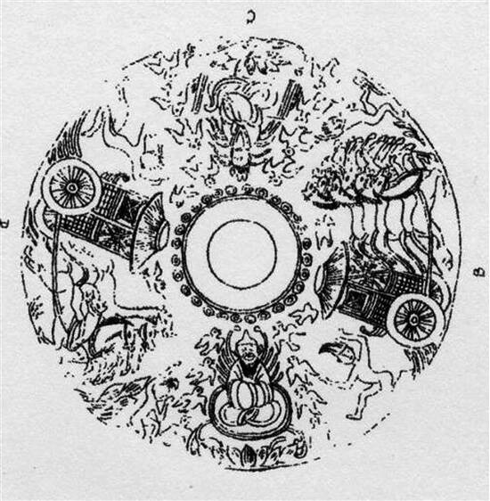 孟津出土的这枚银壳画像铜镜背面的佛像可以说是迄今所见我国最早的佛像遗存,但一直存在争议,主要原因是,它是一件唐代仿制品,而且还是孤例。该铜镜系1984年孟津县公安部门于本县朝阳乡獐羊村侦破文物走私案时查获,出土地点应在该村附近。铜镜直径22厘米,重1321克,圆形,斜缘,半球形钮,双弦联珠纹钮座(图1)。镜背主纹以外为铭带,铭文为:“永元五年四夷服,多贺国家人民息,胡虏殄灭天下复,风雨时节五谷熟,长保二亲得天力。吴,胡伤(阳)里。”(图2)学者考证此年款只能是东汉和帝永元五年,即公元93年(苏健《洛阳发现银壳画像铜镜》,《文物》1987年第2期;贾峨《说洛阳新获东汉永元五年佛像、神人、车马铜镜》,载《河洛文明论文集》,郑州:中州古籍出版社,1993年),甚是。镜背主纹中的主要图像是上下对称的两身坐姿人物和左右对称的两部车马。这两身人物其中一身具有佛像特征,因此一开始就被学者识为“似为佛像”或“佛像”(苏健前揭文;贾峨前揭文)。温玉成先生进一步将这两身人物分别比定为老子和浮屠,因而将铜镜定名为“老子浮屠镜”,并认为整个画面反映的是“老子入夷狄为浮屠”的主题(温玉成《公元1至3世纪中国的仙佛模式》,《敦煌研究》1999年第1期)。