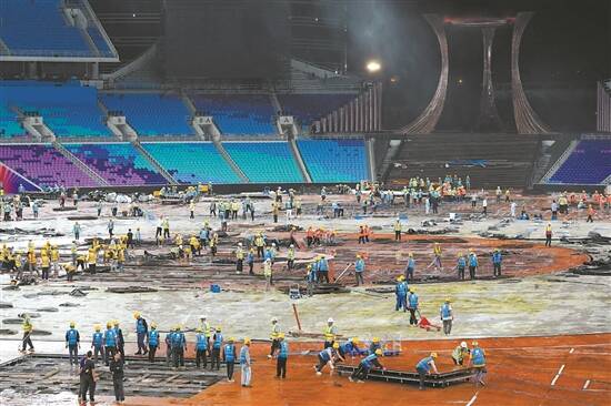 转场工作总历时近30个小时,主要工作包括:2小时完成水舞台1200立方排水;11小时完成总面积达1.8万平方米、重约1200吨的主体育场舞台灯光、扩声设备、钢结构舞台拆除;13小时完成8000平方米草坪砂层填换及铺草工作。