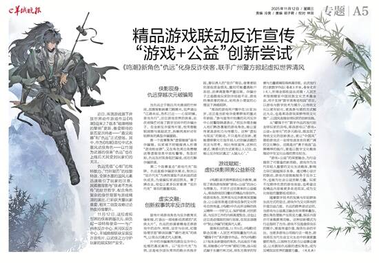 11月12日,这位虚拟世界的侠客跨越次元,肩负起一项特殊使命——与广州市反诈中心、天河区反诈中心、羊城晚报联袂呈现反诈宣传片,以武侠之力守护玩家的现实财产安全。