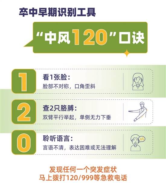 对于占比最高的急性缺血性卒中,发病后4.5小时内是静脉溶栓治疗的黄金时间窗,这是目前恢复脑血流、降低死亡率和残疾率的最有效方法。即便错过黄金时间窗,24小时内仍有血管再通治疗的可能,但疗效会随时间推移大幅下降。因此,快速识别卒中症状是挽救生命的第一步,公众可通过以下“中风120”口诀快速判断:
