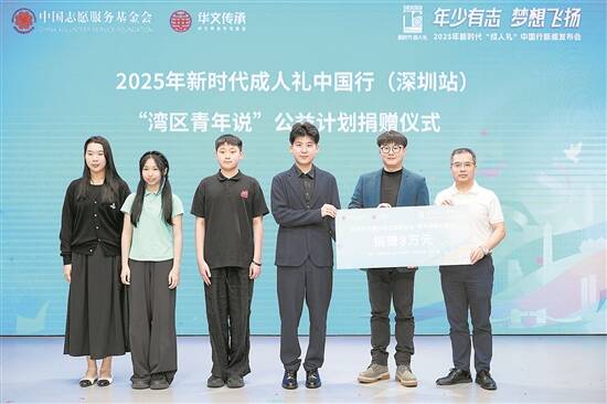 “为新时代‘成人礼’助力加油!”在齐声诵读中,全场共同签署了新时代“成人礼”倡议书。此外,现场还迎来了一笔特别的捐赠——由深圳市关爱行动公益基金会·青年领导力基金的大湾区青年学子共同捐赠的8万元善款。青年领导力基金会秘书长郑雅文分享:“希望基金能够链接更多粤港澳大湾区的同龄人。”