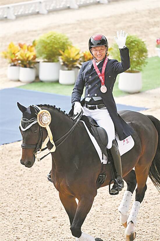 他便顺应它的习惯。每天中午睡醒,雷打不动地带“东哥”出去透透气、吃吃新草。“你带它出去呼吸新鲜空气,吃新草让它舒服一点、愉悦一点,我觉得也很关键。”这种日复一日的陪伴,构筑起深厚的信任。有一次,“东哥”踢蝇子,不小心踢伤了顾兵,顾兵却觉得它“心里可能有点内疚”。结果在上届全运会上,“东哥”帮助顾兵拿到了运动生涯中从未有过的双冠(团体和个人)。本届全运会,东哥再次帮助顾兵拿到了团体和个人两块铜牌。