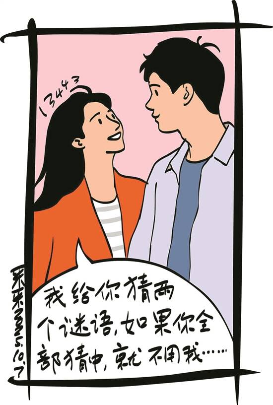 最近,周大朋谈了一个姑娘,名叫王丽,不仅自己像个透着巧劲儿的谜,还喜欢出些谜语给人猜。还记得两人第一次见面,王丽就落落大方地说:“我不介意别人问我的年龄,不过你要想知道,我得出个谜让你来猜是什么生肖,怎么样?”周大朋当即点头答应。