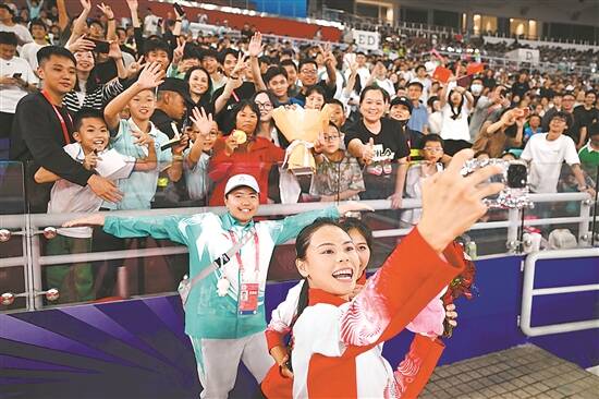 十五运会女子400米栏冠军、广东选手莫家蝶与现场观众自拍合影 周巍 摄