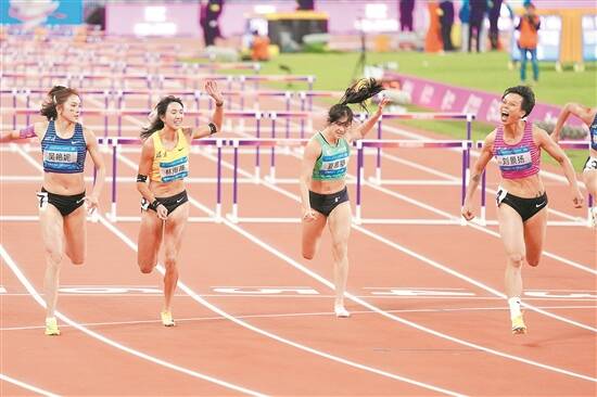 广东选手刘景扬(右一)在田径女子100米栏决赛中 周巍 钟振彬 摄