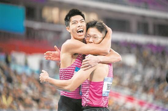 广东选手施君豪(右一)夺冠后与队友拥抱 钟振彬 周巍 摄