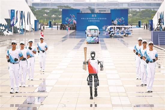 第一个字是“升”,即科技赋能升级智慧全运。本届全运会以科技创新为引擎:火种“源火”由我国自主研发的遥控潜水器“海马”号在南海1522米深处采集可燃冰点燃;机器人“夸父”完成全球首次人形机器人独立参与火炬传递;智能机器人在开幕式上协同奏乐。指挥调度大脑、智能照明、追光跑道等科技产品广泛应用于赛事场馆,自由视角观赛、百米级精准气象预报、无人智驾出行等提升了参赛观赛体验。国际广播中心分发超300路公用信号,“广东+港澳”双节点云转播分发系统支持了媒体云端获取信号与协同制作。