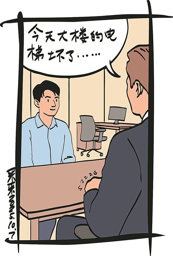 因为前一天跑单到很晚,刘荣第二天一早一骨碌爬起来,简单洗漱后就往公司面试地点赶,差一点就迟到。好在首轮面试很顺利,他进入了第二环节,即到10楼面见总经理,接受更为严格的考核。面试官告诉他,今天大楼的电梯坏了,他得从一楼步行上去。 (刘琪瑞)