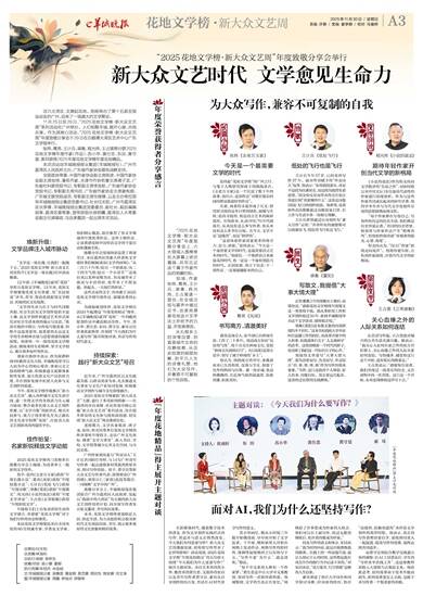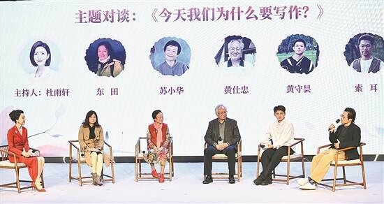 在新媒体时代,随着数字技术的普及,作为文学创作实践形式的写作,其边界与意义正悄然改变。今天我们为何还要写作?新大众文艺的蓬勃发展,给传统写作带来了怎样的影响?活动现场,2025花地文学榜“年度花地精品”的五位得主围绕“今天我们为什么还要写作?”展开主题对谈。来自艺术界的苏小华、教育界的黄仕忠、文旅界的东田以及青年写作者黄守昙、索耳从自身创作经历出发,共话在AI时代坚守写作的意义。