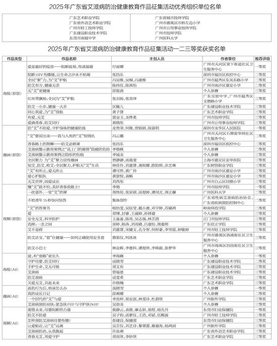 全民聚力,为“艾”护航!一起当好“防艾科普达人”!为全面贯彻实施《中国遏制与防治艾滋病规划(2024-2030年)》《广东省遏制与防治艾滋病行动方案(2025-2030年)》,助力推动《广东省艾滋病防治条例》全面普及,以创新为动力推动广东省艾滋病防治工作高质量发展,近日,2025年广东省艾滋病防治健康教育作品征集活动圆满收官。活动评选出多个奖项,旨在进一步加强艾滋病防治宣传教育,提高社会公众对艾滋病的认知与防护意识。