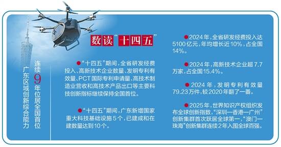 “六个继续领先”彰显了广东科技发展的核心优势。王月琴介绍,2025年,广东区域创新综合能力连续9年位居全国首位;“十四五”期间,全省研发经费投入、高新技术企业数量、发明专利有效量、PCT国际专利申请量、高技术制造业营收和高技术产品出口等主要科技创新指标继续保持全国首位。