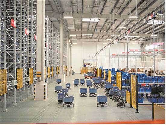 惠州的京东物流智狼仓是今年10月投入使用的,其总体面积近2万平方米。在这个智能仓储一期仓库内,记者看到几十个智狼搬运机器人正在检送口依次排队。接到订单指令后,搬送机器人就立即响应,沿着预设路径精准穿梭,将存放商品的料箱从立体货架中取出,通过智狼飞梯机器人实现立体转运。