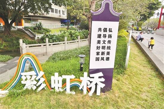 古老河道驷马涌经修复后除臭,两岸升级为街坊家门口的后花园。彩虹桥一端连着绿美,一端连着民生。“此柱无人题驷马,夕阳有客系兰桡。”明代赵介的诗句被篆刻在彩虹文化广场的梯级,凸显古水古桥的历史底蕴。彩虹元素也融入了如今的驷马涌沿岸景观,彩虹墙绘为特色的“彩虹茶餐”,是居民自主开发的商业空间,售卖简餐、茶饮等,空间不大却凸显了片区的属地特性和活力。