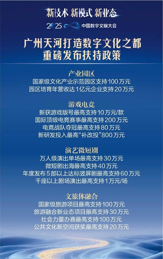 12月18日,在2025年中国数字文娱大会上,作为全国数字文化产业核心集聚区的广州市天河区,发布了促进数字文化产业高质量发展的政策措施,包括《广州市天河区促进文化产业园区和游戏电竞产业高质量发展的若干政策措施》《广州市天河区促进文旅体产业高质量发展的若干政策措施》。天河区计划通过精准扶持,推动数字技术与文化产业深度融合、创新发展。
