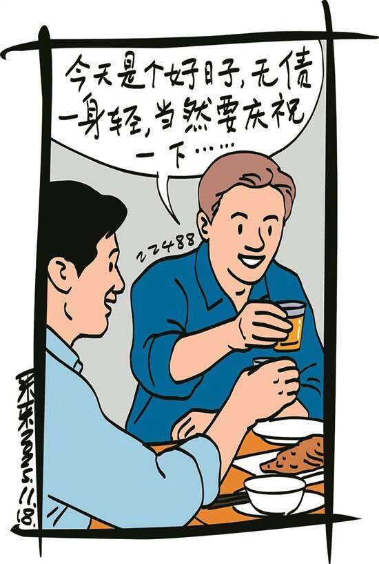 当两人赶到,李华已经点了一大桌子菜,站起身来招呼他俩入座:“菜都快凉了,别客气。”爱开玩笑的刘强忍不住问:“有啥好事,说出来听听,满足我俩的好奇心。”李华脱口而出:“今天是个好日子,无债一身轻,当然要庆祝一下。”