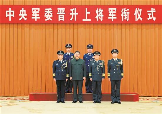 晋衔仪式在嘹亮的中国人民解放军军歌声中结束。随后,习近平等领导同志同晋升上将军衔的军官合影。