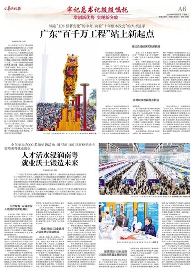 依托“百县千镇万村高质量发展工程”,广东推动就业资源向粤东、粤西、粤北地区下沉扎根,组织地市组团招聘、精准引才,破解基层企业“招聘难”困境,让人才活水精准流淌至发展急需之地,实现“投资于人”的区域均衡覆盖。