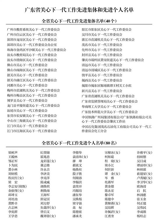 2025年12月31日,纪念广东省关工委成立25周年暨全省关心下一代工作表彰会议在广州召开。会上宣读了省关工委、省文明办关于表彰全省关心下一代工作先进集体和先进个人的决定。40个先进集体和80名先进个人获表彰。