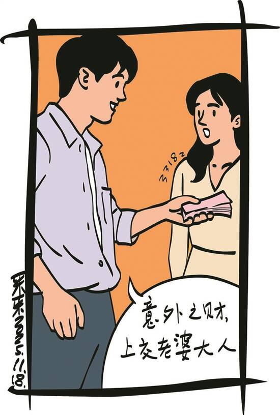 小两口结婚5年来,相亲相爱。小玉擅长理财,华军便把每个月工资准时上交,小玉则马上转回1000元,嘱咐其中500元是零花钱,另500元是华军的彩票专项资金,这是当初结婚前两人的约定。